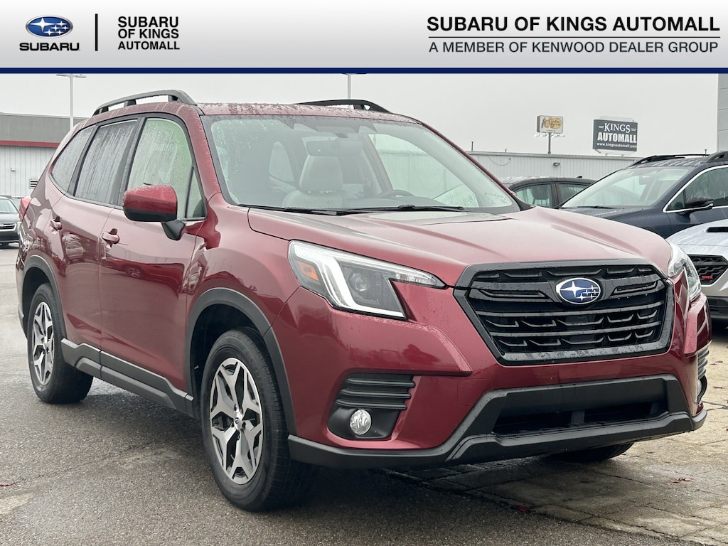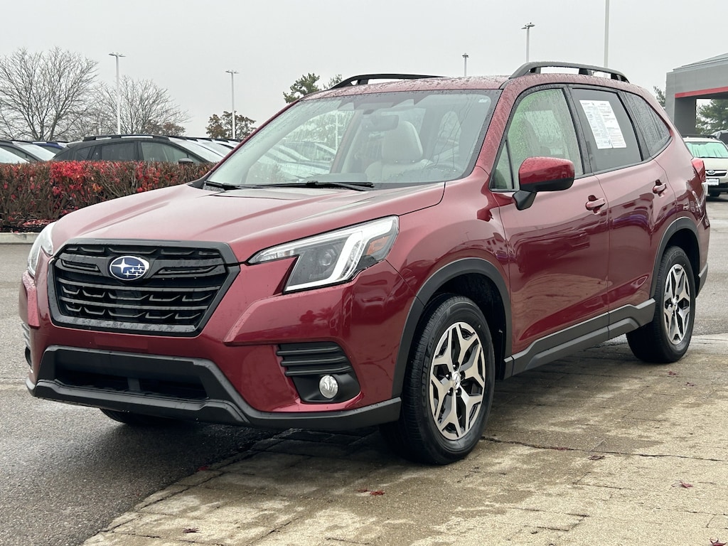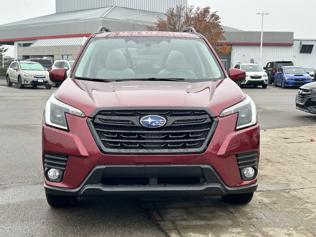 Certified. Crimson Red Pearl 2023 Subaru Forester Premium AWD Lineartronic CVT 2.5L 4-Cylinder DOHC 16V Clean Carfax, Sunroof | Moonroof, Certified, 1-Owner, 1-Owner Clean Carfax, All Wheel Drive | AWD, Heated Seats, Local Trade, Hard to Find, Sirius XM, 4-Wheel Disc Brakes, ABS brakes, Air Conditioning, AM/FM radio: SiriusXM, Anti-whiplash front head restraints, Auto High-beam Headlights, Automatic temperature control, Blind Spot Detection w/RCTA & Power Rear Gate, Blind-Spot Detection (BSD), Brake assist, Driver's Seatback Divided Pocket, Dual front impact airbags, Dual USB Charge Ports, Electronic Stability Control, Emergency communication system: STARLINK Safety and Security (Subscription Required), Exterior Parking Camera Rear, EyeSight System, Front anti-roll bar, Front fog lights, Fully automatic headlights, Heated Front Bucket Seats, Knee airbag, Multi-Function High Grade Display, Occupant sensing airbag, Overhead airbag, Panic alarm, Power moonroof: Panoramic, Power Rear Gate, Radio data system, Radio: Subaru Starlink 6.5 Multimedia Plus System, Rear anti-roll bar, Security system, STARLINK/Apple CarPlay/Android Auto, Wheels: 17 x 7.0 J Black Machine Finish Alloy.
