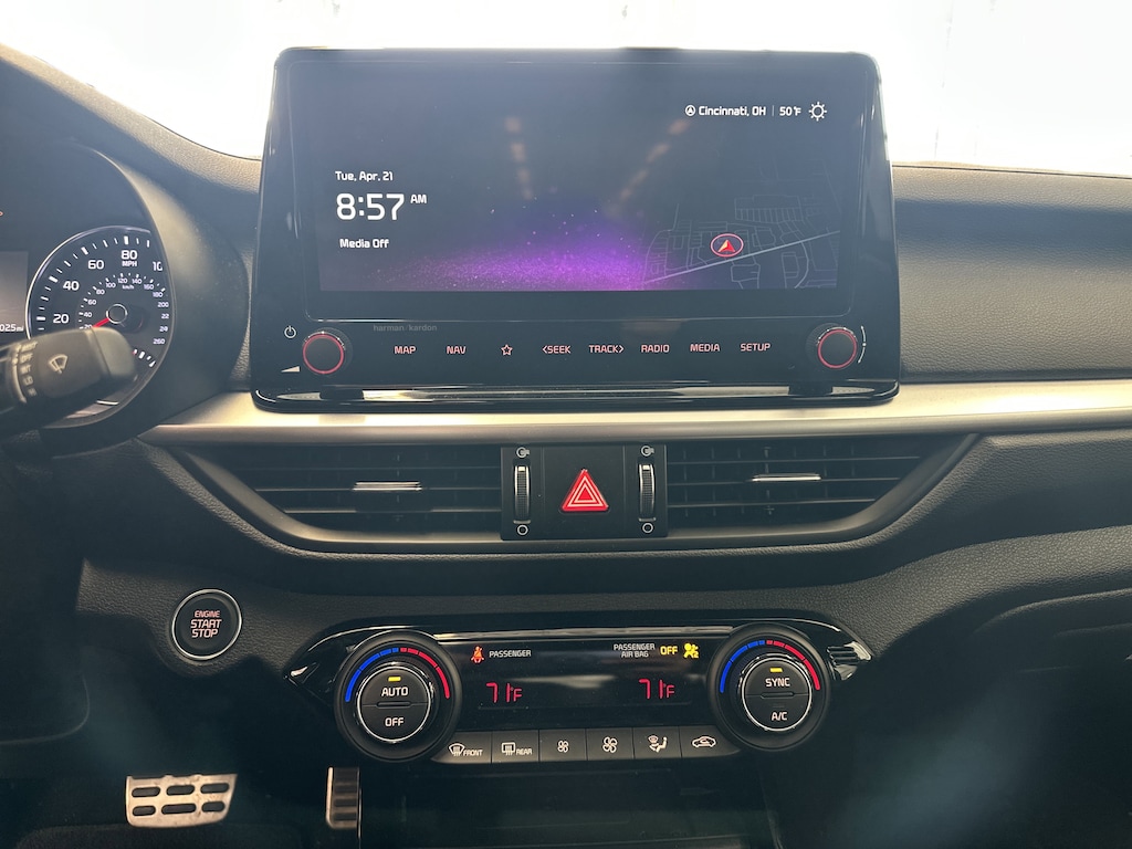 THIS VEHICLE ALSO HAS THE FOLLOWING OPTIONS AND FEATURES:GT-Line Premium Package (harman/kardon® Premium Audio, LED Interior Lighting, Power Sunroof, and Wireless Charging), GT-Line Sport Premium Package (10-Way Power Driver's Seat, Heated & Ventilated Front Seats, Rear AC Vent, Rear USB Charger, and SynTex Seat Trim), Forte GT-Line, 4D Sedan, 2.0L I4 MPI, FWD, Apple CarPlay & Android Auto, Auto High-beam Headlights, Electronic Stability Control, Exterior Parking Camera Rear, Navigation System, Wheels: 17" x 7.0 Alloy, 4-Wheel Disc Brakes, 6 Speakers, ABS brakes, Air Conditioning, Alloy wheels, AM/FM radio: SiriusXM, Automatic temperature control, Brake assist, Bumpers: body-color, Cloth & SynTex Seat Trim, Delay-off headlights, Driver door bin, Driver vanity mirror, Dual front impact airbags, Dual front side impact airbags, Emergency communication system, Front anti-roll bar, Front Bucket Seats, Front Center Armrest, Front dual zone A/C, Front fog lights, Front reading lights, Front wheel independent suspension, Fully automatic headlights, Heated door mirrors, Illuminated entry, Leather Shift Knob, Leather steering wheel, Low tire pressure warning, Occupant sensing airbag, Outside temperature display, Overhead airbag, Overhead console, Panic alarm, Passenger door bin, Passenger vanity mirror, Power door mirrors, Power steering, Power windows, Radio data system, Radio: 10.25" Display Audio, Rear seat center armrest, Rear window defroster, Remote keyless entry, Security system, Speed control, Split folding rear seat, Spoiler, Sport steering wheel, Steering wheel mounted audio controls, Tachometer, Telescoping steering wheel, Tilt steering wheel, Traction control, Trip computer, Turn signal indicator mirrors, and Variably intermittent wipers.
